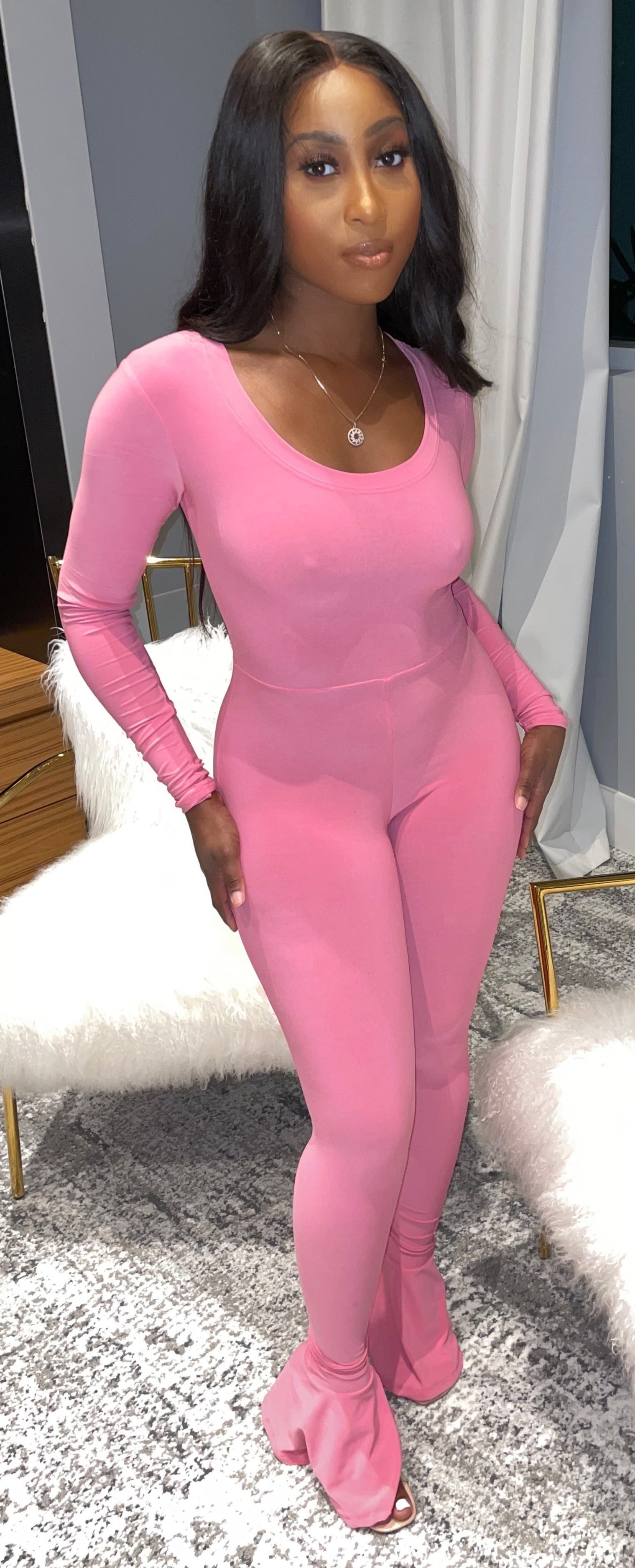 Turn up the glam with our Barbie Pink Jumpsuit—a standout piece designed to hug your curves and make a statement. Crafted from ultra-comfy, stretchy fabric, this long-sleeve jumpsuit fits like a dream, hugging your skin while keeping you effortlessly chic.